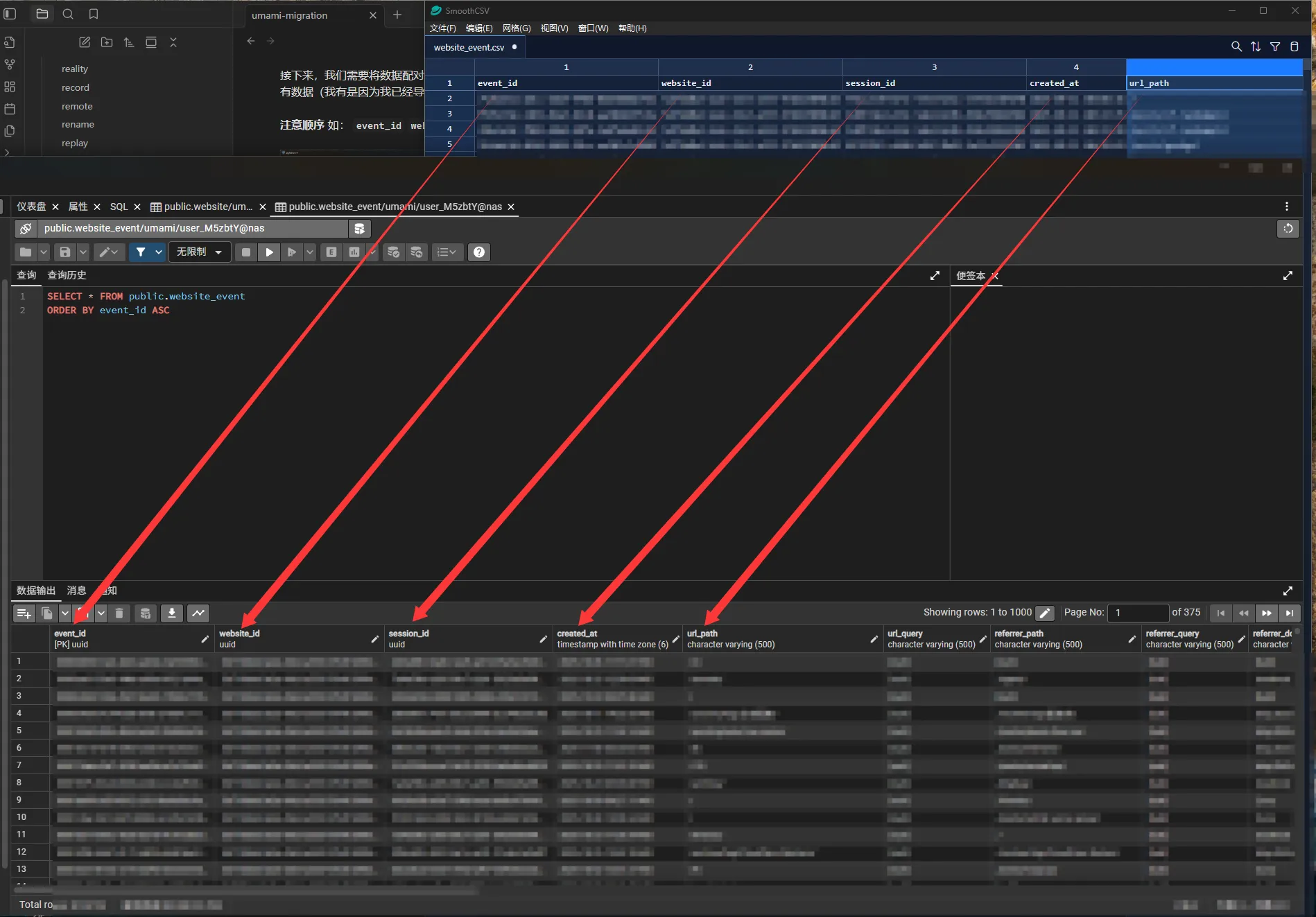 接下来,我们需要将数据配对,我们先查看 website_event.csv 这张表。这里应该只有表头,没有数据(我有是因为我已经导入完成了,教程是后写的)