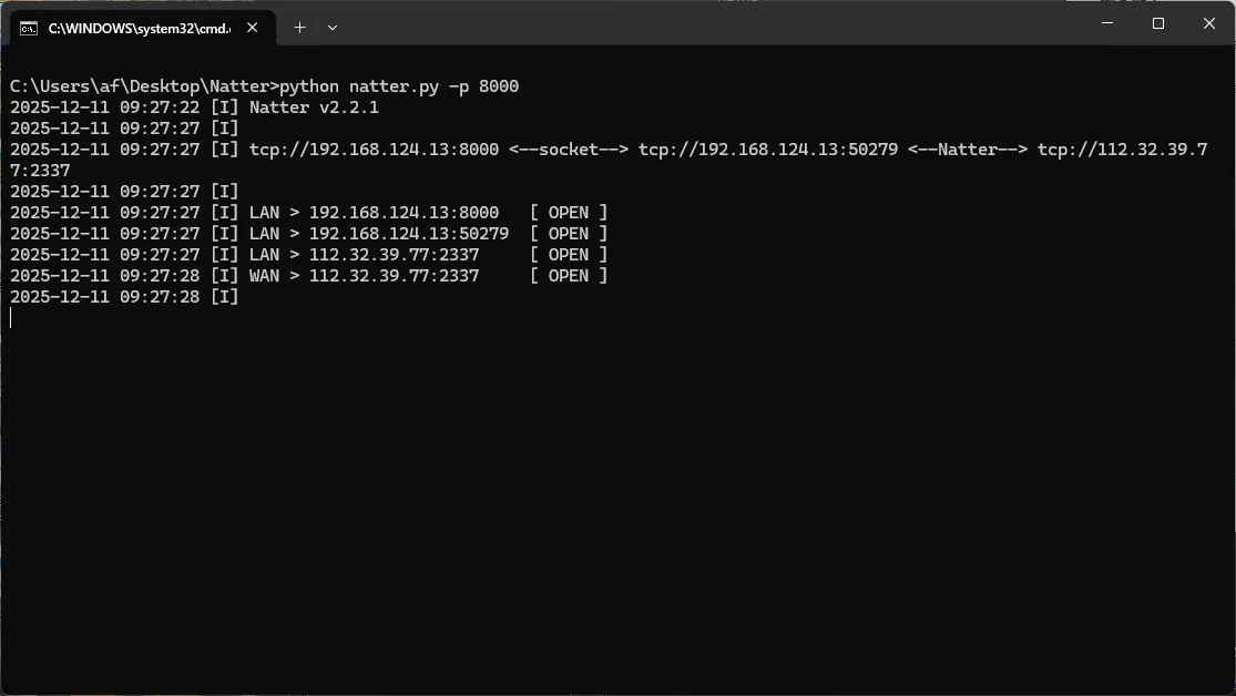 当你的家庭网络为 NAT1 ,则可以使用类似这样的软件将你的 内网端口 直接打到 公网端口 (貌似该程序对TCP分片敏感,会导致RST) MikeWang000000/Natter: Expose your TCP/UDP port behind full-cone NAT to the Internet.
