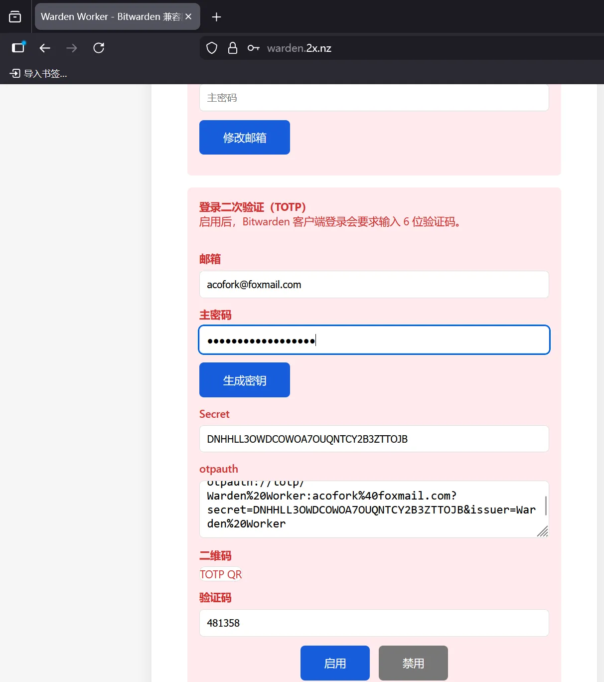 接下来,前往网页端( /demo.html 默认使用的是 Vaultwarden的前端,可能会有些Bug),启用2FA: https://cfbw.2x.nz (用另一个TOTP验证器存储)