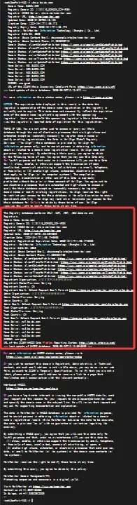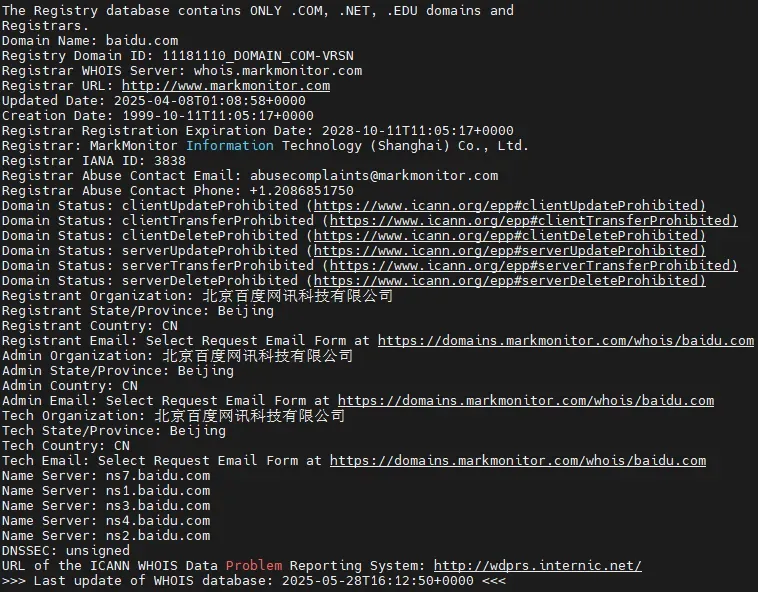 可以看到,成功查询到了 baidu.com 的Whois信息。但是实际上这个命令的输出有这么长