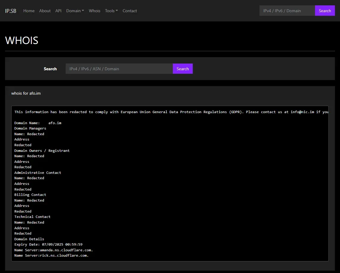 你是否用过某些Whois查询网站?如图为IP.SB的WHOIS查询服务,可以通过 WHOIS - IP.SB 快速查询一个域名的Whois