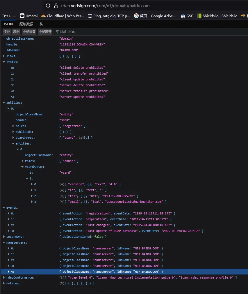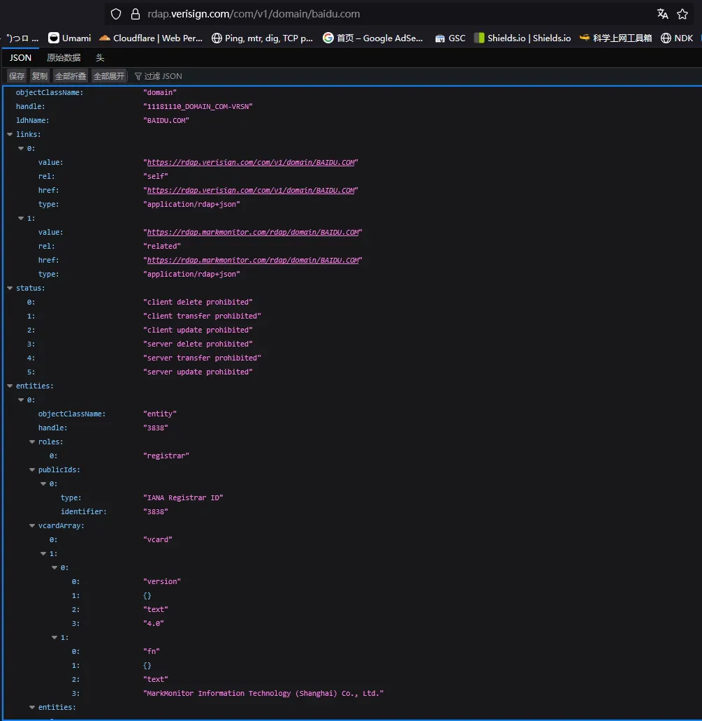 有的,兄弟有的,这就是RDAP(Registration Data Access Protocol),注册数据访问协议。使用了RDAP的域名查询Whois将会返回一个标准的JSON格式的输出,并且查询是通过标准的RESTAPI,也就是Web协议,如下图